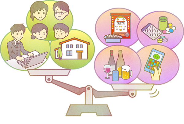 依存症になると、日常生活や心身の健康、大切な人間関係などに問題が起こっているにもかかわらず、依存対象の物質や行動をやめ続けることが難しくなります。