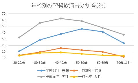 1日当たりの純アルコール摂取量が男性で40g以上,女性20g以上の飲酒は生活習慣病のリスクを高めるとされています。このような危険な飲酒の習慣を持つ人は、平成28年度の国民健康・栄養調査では男性の14.6%、女性の9.1%に認められました。男女とも40-50代に最も割合が多い結果でした。
